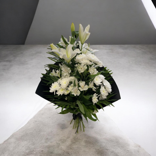 Ein elegantes und stilvolles Blumenarrangement aus edlen weißen Lilien und zarten weißen Rosen, harmonisch ergänzt durch frisches, dekoratives Grün. Die Lilien stehen für Reinheit und Respekt, während die weißen Rosen Aufrichtigkeit und Eleganz symbolisieren – eine geschmackvolle Wahl für besondere Anlässe, feierliche Momente oder als Ausdruck von Wertschätzung und Mitgefühl.